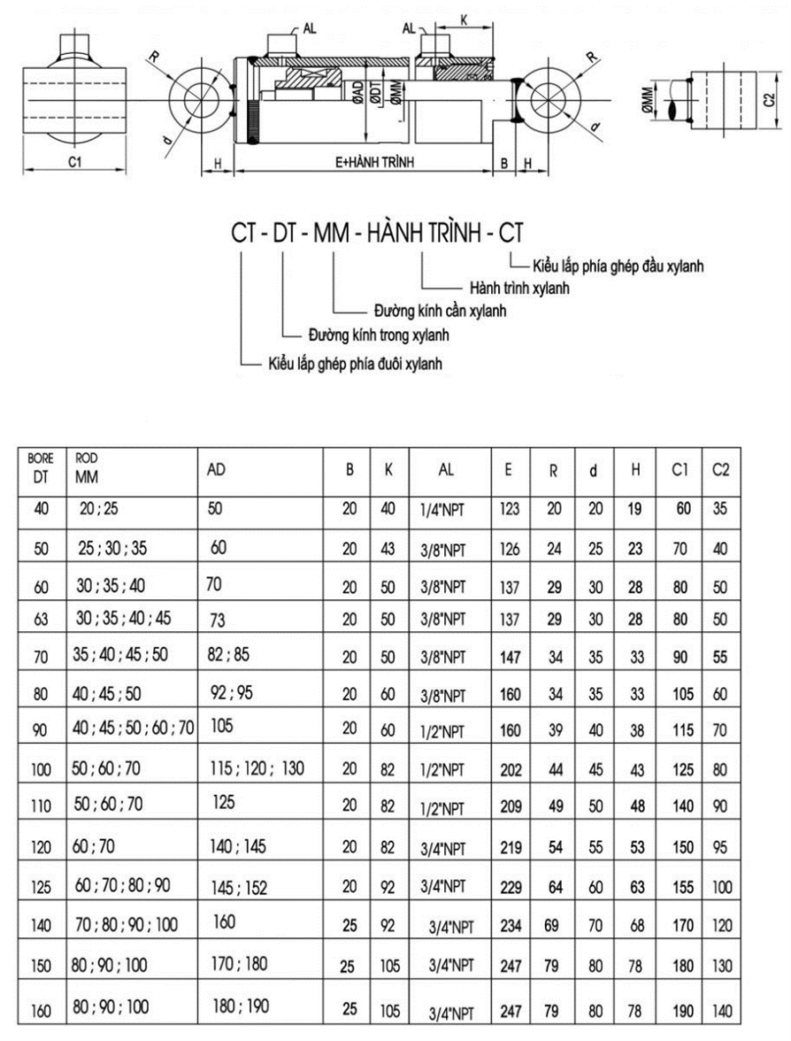 - Bản vẽ và thông số kích thước xy lanh kiểu lắp CT – CT